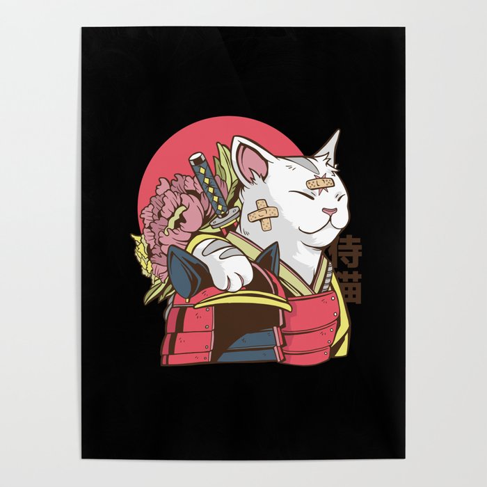 Funny Anime Samurai Cat With Armor And Bruises Poster By Fleur Et Retro Couleurs Pastels Society6